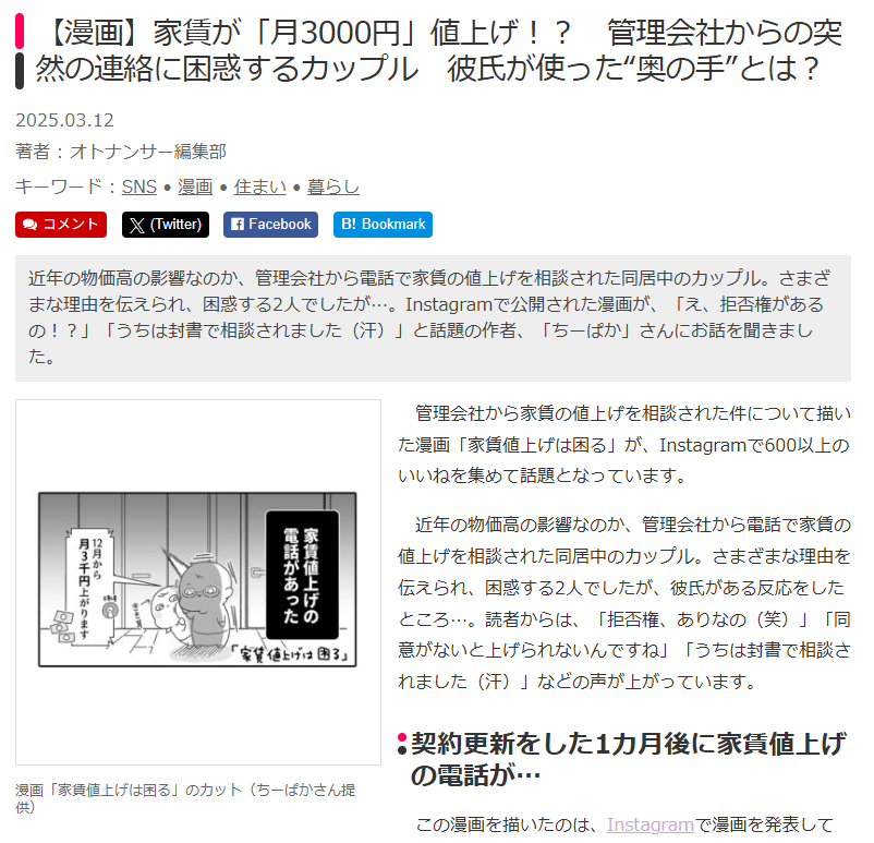 ウェブメディア「オトナンサー」様に漫画「家賃値上げは困る」をご紹介頂きました!